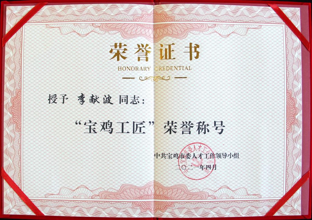 寶光股份李獻波榮獲“寶雞工匠”榮譽稱號