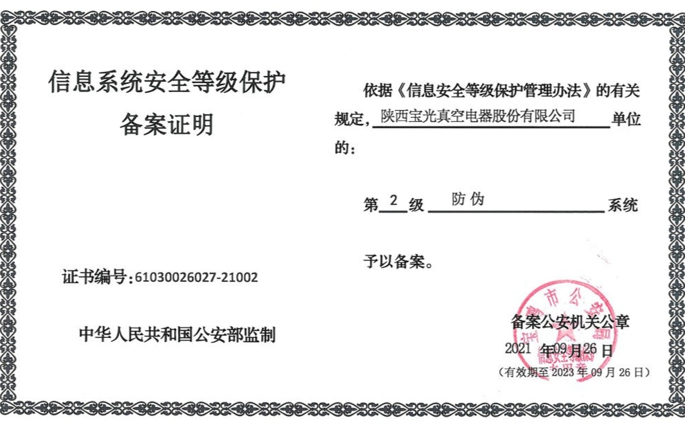 9月26日,寶光股份順利取得由寶雞市公安局下發(fā)的三份信息系統(tǒng)安全等級(jí)保護(hù)備案證明,該證明分別對(duì)公司第2級(jí)ERP系統(tǒng)、防偽系統(tǒng)、官方網(wǎng)站系統(tǒng),予以備案。