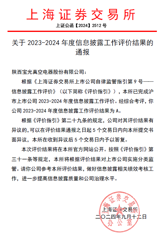 日前,上海證券交易所(以下簡稱“上交所”)發布了《滬市上市公司2023至2024年度信息披露工作評價結果》,寶光股份(600379)榮獲信息披露工作最高考核評級A級,這是公司首次獲此榮譽,是上交所對寶光股份信息披露、公司治理、投資者關系管理、履行社會責任等方面的高度認可和肯定。
