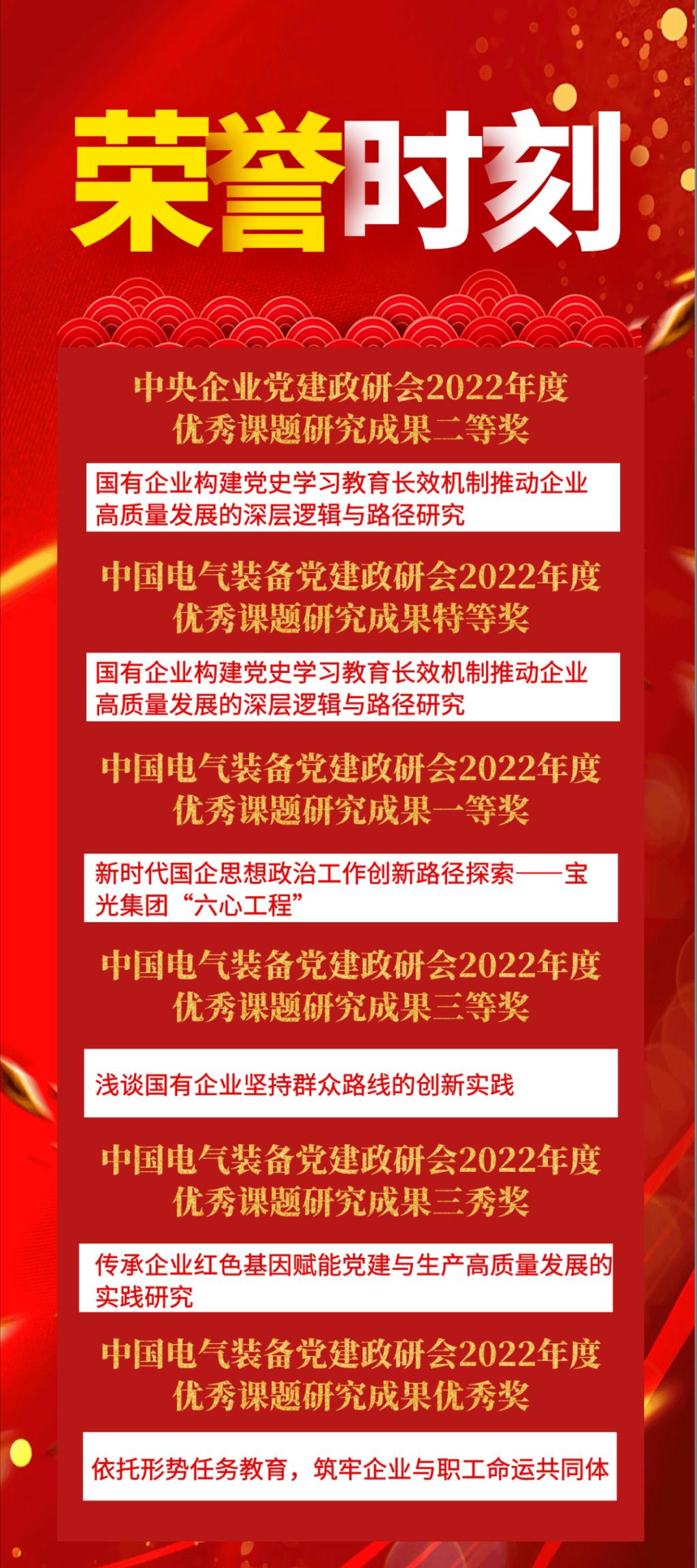 2022年,中國西電集團堅持以習近平新時代中國特色社會主義思想為指導,深入學習宣傳貫徹黨的二十大精神,按照中國電氣裝備黨建政研會工作部署,立足企業實際,堅持問題導向,優化政研選題,聚焦研究重點,積極參加中國電氣裝備及以上政研會課題立項,切實抓好央企黨建政研會和中國機械政研會課題研究,形成8項具有應用性和指導性的研究成果。同時,認真落實中國電氣裝備黨建政研會工作要求,積極推進公司2022年課題研究工作,確定3個重點研究方向,下發參考選題25個,搭建5個課題組,審定立項課題89個,形成A類成果26個。2022年,中國西電集團榮獲“機械行業政治思想文化建設貢獻榜2021年度分榜上榜單位”與“2021年度機械行業機械紅色故事宣傳推廣貢獻單位”等榮譽,中國西電集團及所屬3家企業政研成果入選“2021年度機械行業政治思想文化建設特色突出案例”。