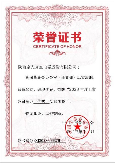 自寶光股份上市以來(lái),董事會(huì)與管理層高度重視各項(xiàng)工作,董辦團(tuán)隊(duì)切實(shí)關(guān)注各項(xiàng)履職能力提升,堅(jiān)守初心,嚴(yán)格按照法律法規(guī)開(kāi)展各項(xiàng)工作。獲得此項(xiàng)榮譽(yù)充分體現(xiàn)了中國(guó)上市公司協(xié)會(huì)對(duì)寶光股份董事會(huì)辦公室信息披露管理、治理機(jī)制建設(shè)、投資者關(guān)系管理、相關(guān)制度制定修訂、ESG管理披露、監(jiān)督培訓(xùn)等各項(xiàng)工作成果的高度認(rèn)可和充分肯定。