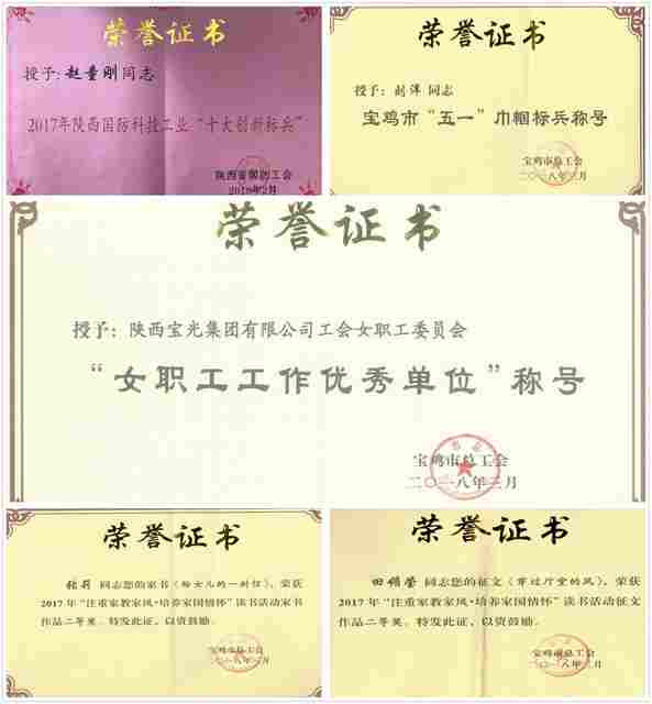 寶光集團(tuán)女工委榮獲寶雞市總工會(huì)女職工工作優(yōu)秀單位;精密陶瓷公司趙童剛同志榮獲陜西省國(guó)防科技工業(yè)“十大”創(chuàng)新標(biāo)兵;進(jìn)出口公司劉洋同志榮獲寶雞市“五一”巾幗標(biāo)兵;C產(chǎn)品制造部田媚瑩同志在寶雞市“注重家教家風(fēng)  培養(yǎng)家國(guó)情懷”讀書(shū)征文活動(dòng)中榮獲二等獎(jiǎng);A產(chǎn)品制造部張莉同志在寶雞市讀書(shū)活動(dòng)中榮獲家書(shū)作品二等獎(jiǎng)。