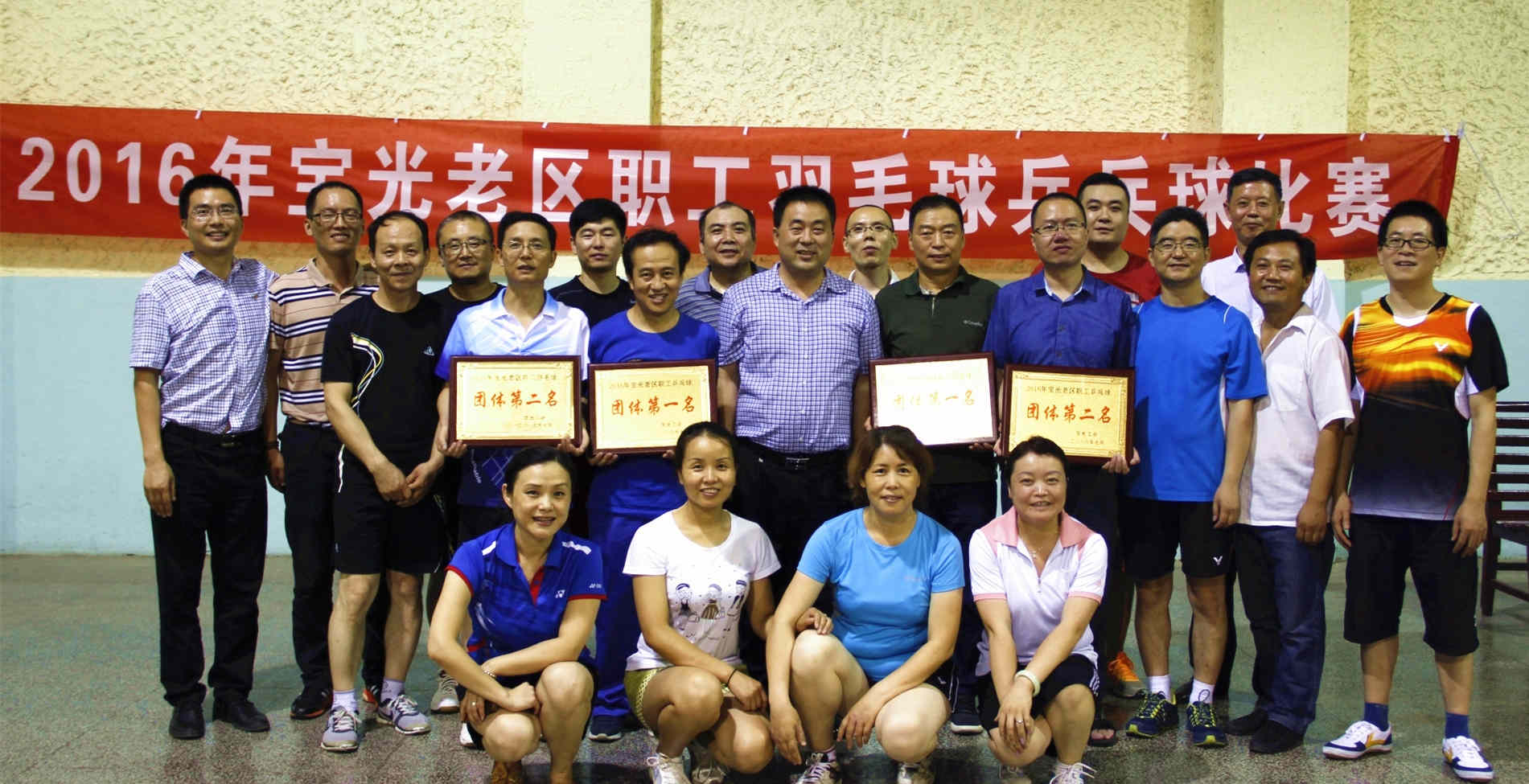 比賽活動得到老區各單位的大力支持,職工參與熱情高漲,比賽在工會副主席姜萬宏宣布比賽規則后拉開帷幕。賽場上氣氛緊張而熱烈,各參賽隊隊員精神飽滿、戰術靈活,渾汗如雨,比賽場面精彩不斷……經過近4個小時的激烈角逐,氣體公司分別獲得羽毛球和乒乓球團體賽第一名,動力部獲得羽毛球團體賽第二名,電子玻璃廠獲得乒乓球團體賽第二名,其他參賽隊獲得優秀獎。賽后,參賽隊員進行了合影留念。