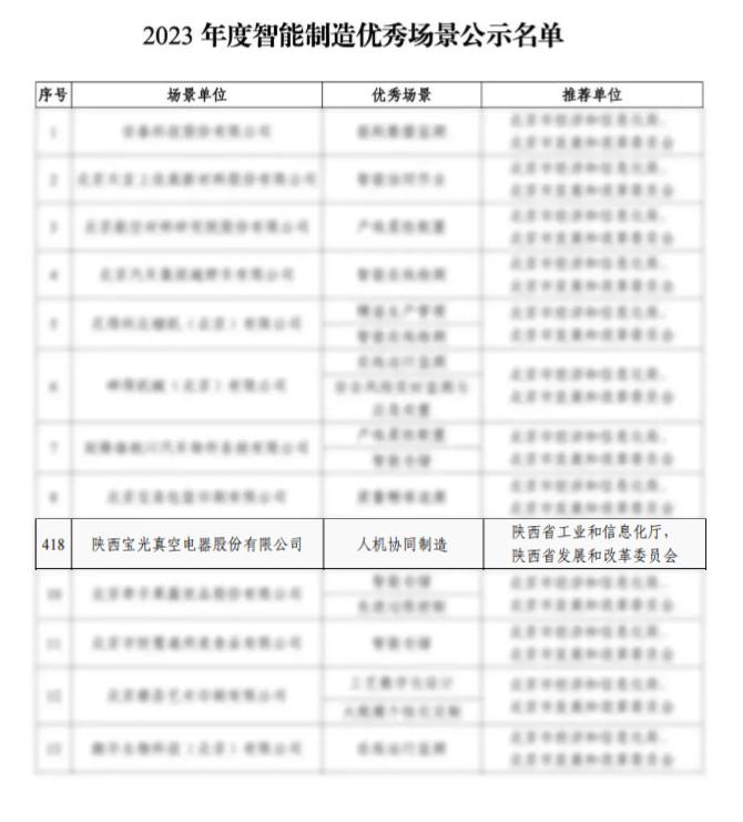 近期,工業和信息化部公布了“2023年度智能制造示范工廠揭榜單位和優秀場景名單”,寶光股份申報的《真空滅弧室關鍵零件智能生產線》項目順利入選智能制造示范優秀場景,標志著寶光股份智能制造水平邁上新臺階。